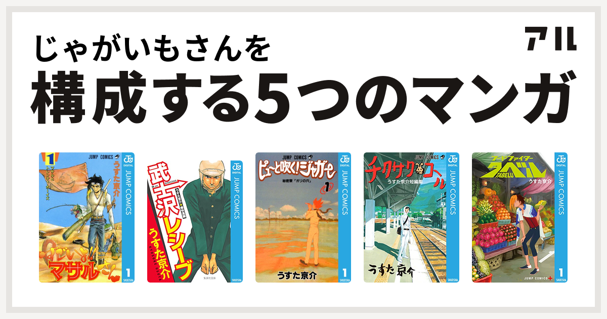 じゃがいもさんを構成するマンガはセクシーコマンドー外伝 すごいよ マサルさん 武士沢レシーブ ピューと吹く ジャガー チクサクコール うすた京介短編集 フードファイタータベル 私を構成する5つのマンガ アル